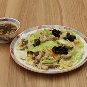 朱華園のあの焼きそばを忠実に再現した、野菜とチャーシューたっぷりの極上焼きそば。お好みで自分で調整をしながらソースをかけて頂く。鶏ガラとしょうゆのブレンドスープがついており、そのまま飲んでも◎