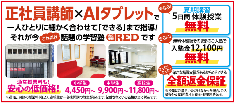 夏休みの長い期間、勉強を頑張っている周りの子に置いて行かれるかも…と不安になり、夏期講習の受講を検討しているご家庭もいらっしゃるかと思います。ただ、お子様の得意不得意も様々で、どの方法が一番適しているか分からず塾選びに悩んでいる方も多いかと思います。自立学習塾REDでは、講師が全て正社員でプロの指導により生徒一人ひとりに向き合うことで「できる」までを指導しています。さらに当塾の特徴の『AIタブレット』は、お子様特有の癖を把握して、出題方法を調整したり、定期テスト対策、入試対策、総復習学習、先どり学習など、演習の量を最適化することで理解度に合わせて、それを講師との連携により学習効果を最大限に高めて『自分で解く力』を身につけます。今なら夏期講習5日間の体験授業を『無料』で行っております。さらに無料体験後のご入塾で入塾金も無料!是非この機会に一度お試しください!