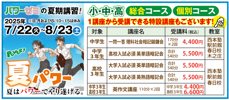 パワーゼミの夏期講習は「小・中・高の総合コースと個別コース」で、各学年・目標に応じた学習ができます。中学生には「一問一答理科社会暗記鍛錬会」「高校入試必須英単語暗記会」「英作文講座」、高校生には「大学入試必須英単語・英熟語暗記会」や「英作文講座」など、暗記力と記述力を鍛える実戦的な特別講座をご用意しています。