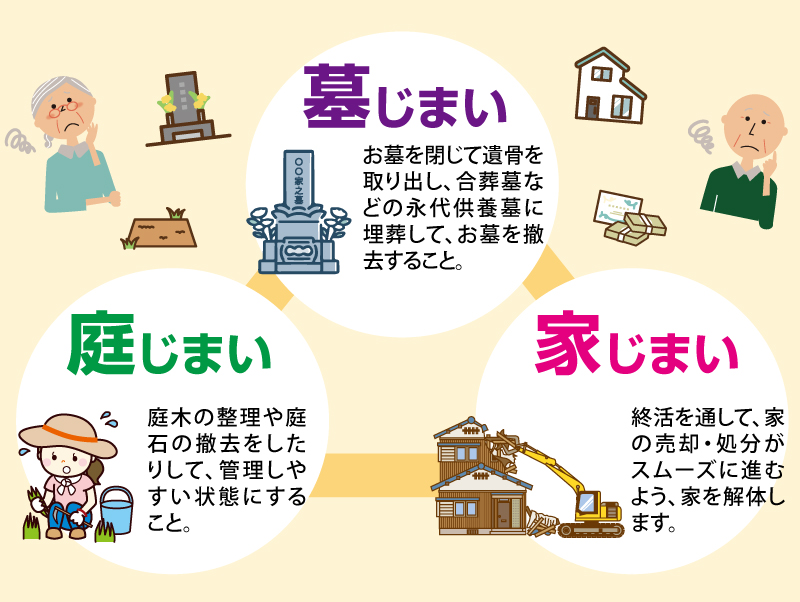 「墓じまい」「庭じまい」「家じまい」は、いずれも【終活】をする上で、生活スタイルの変化に合わせてきちんと考えたいことです。東洋石材は、“終活のプロ“として、これらの窓口を担い、お客様の生活の負担や不安をできるだけなくしていきます。お墓のことはもちろん、家やお庭の相談もお気軽にお問い合わせください。提携会社と協力し、お客様が安心して終活できるように、そしてこれからの生活がスッキリと豊かに送れるように、サポートさせいただきます。