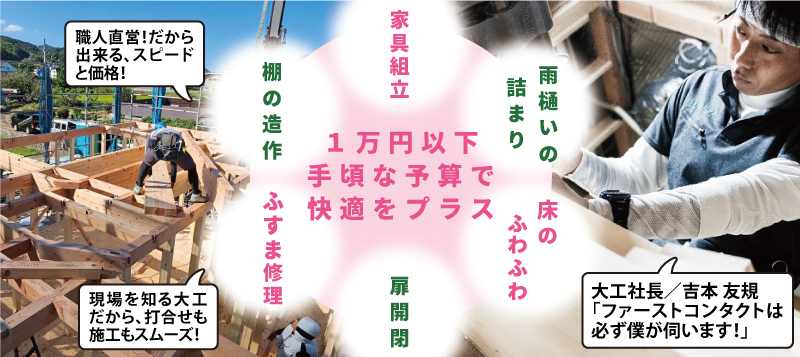 「建設会社に頼むのはちょっと気が引ける…」「前に頼んだら断られたしな…」等、これって頼んでいいのかな?とそんな小さな工事こそ『おかかえ大工』の出番!1万円以下で頼めるちょっとしたお困りごとを地域のプロがスピーディーに解決します!最短即日訪問!大工が直接施工するので部分的なリフォームはもちろん、お家全体の本格リフォームも対応します!