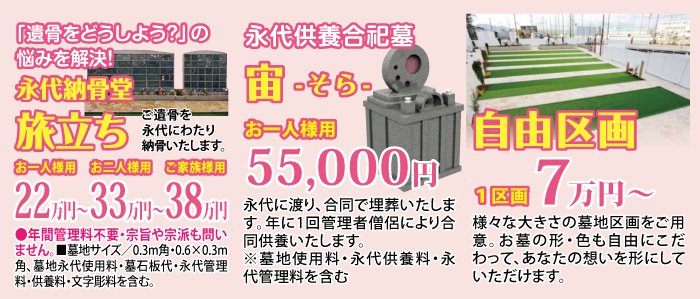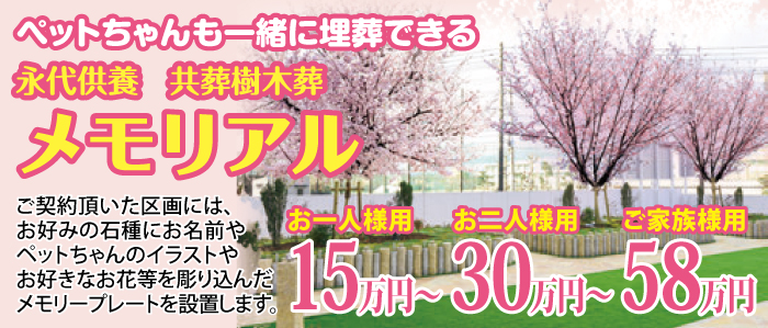 大切なペットと“ずっと一緒”に眠れる新しい霊苑が今年の1月神辺町に誕生しました。一般墓・永代供養樹木葬「メモリアル」・ペット専用区画「メモリー」など、多彩な埋葬スタイルをご用意。家族の一員であるペットと共に眠ることで、喪失感を和らげ、心の支えになります。管理負担の少ない永代供養も選べて安心。駐車場や水くみ場など設備も完備し、お墓参りも快適です。