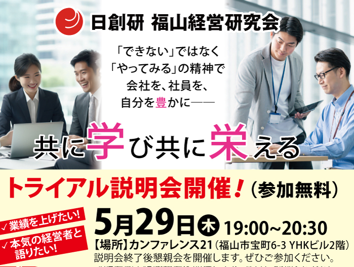 「無料トライアル説明会開催!」悩まれている経営者の方へ!新しい自分探し、会社創り!!