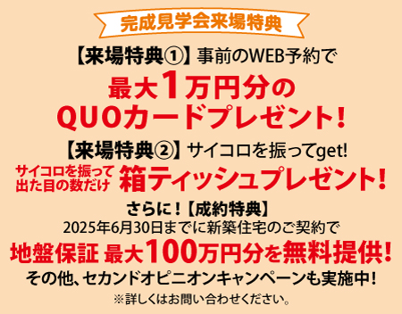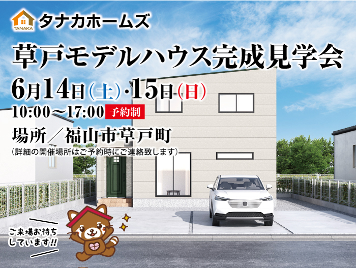 草戸町に機能性抜群の2階建てモデルハウスがオープンしました。収納や動線にこだわった、子育て世代にぴったりの住まいです。6月14日(土)と15日(日)の2日間、完成見学会を開催します。シューズクロークや和室、回遊性のある家事動線など、暮らしやすさをデザインした「草戸モデルハウス」をぜひご体感ください。今なら、WEB予約からのご来場で最大10,000円分のQUOカードをプレゼント!スタッフ一同、ご来場をお待ちしております。