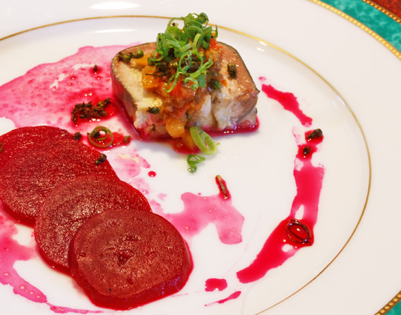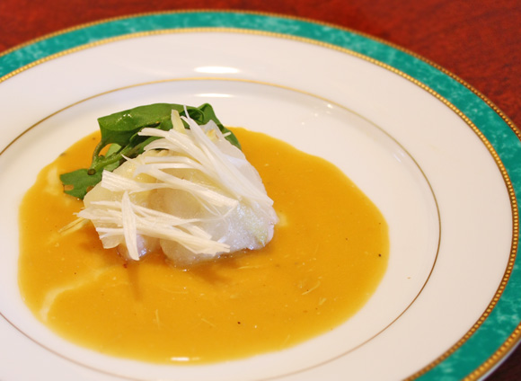 今日の魚料理は、金目鯛の蒸しものに 海老のソースが何とも言えない逸品だ。