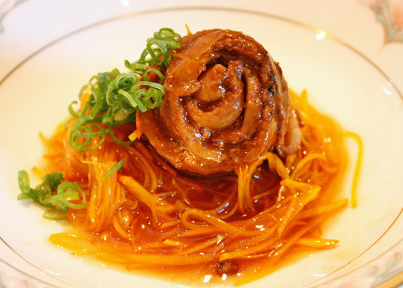 繊細な盛り付けの豚の角煮は、八角が甘みと僅かな苦味と辛味の独特な味を醸し出している。