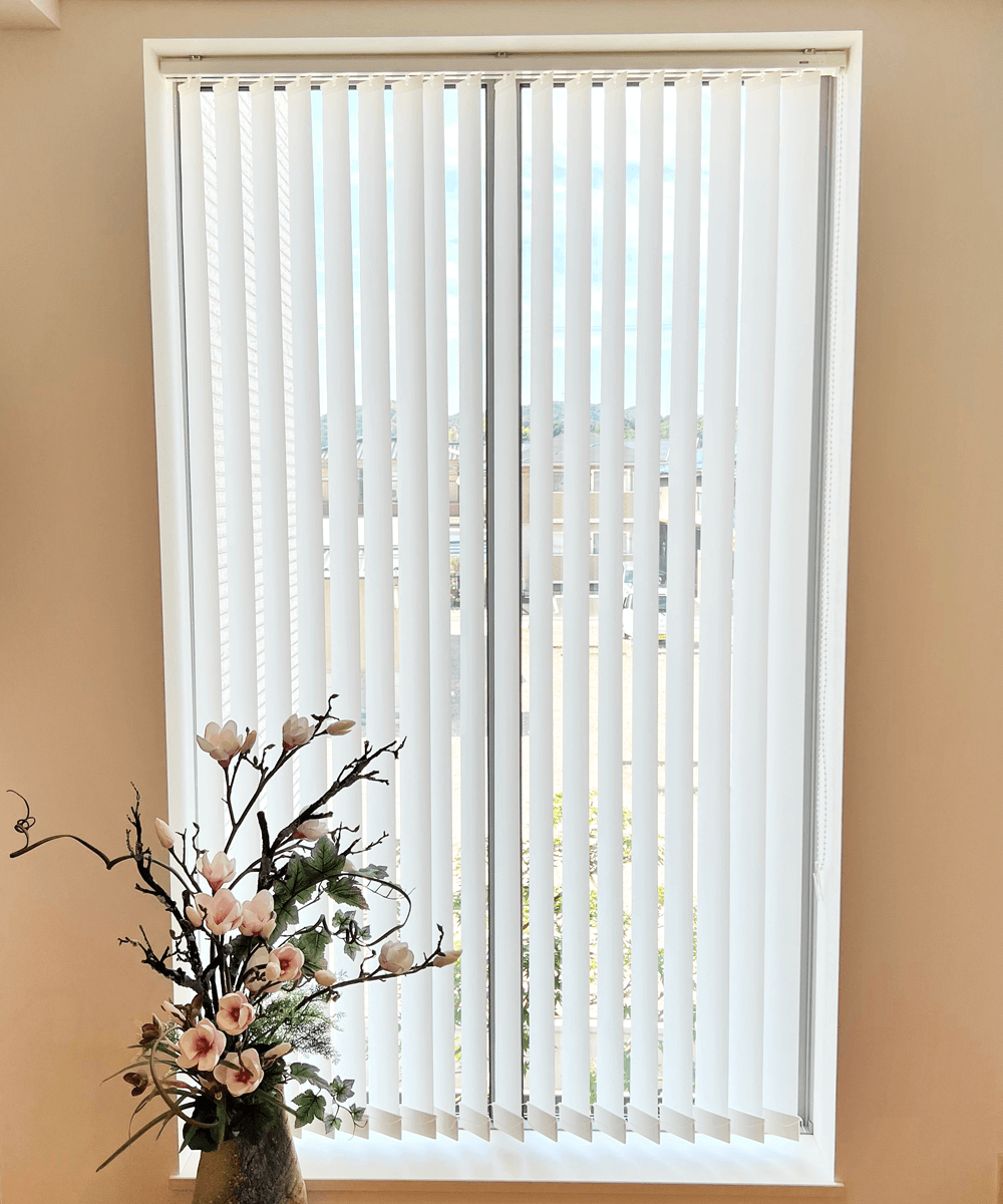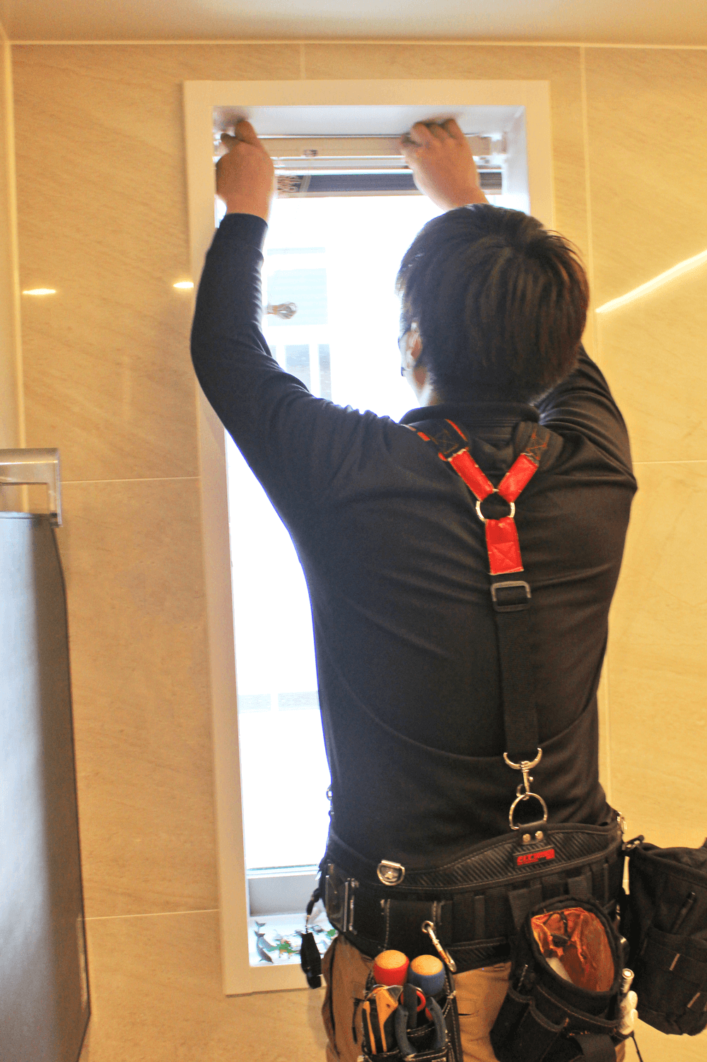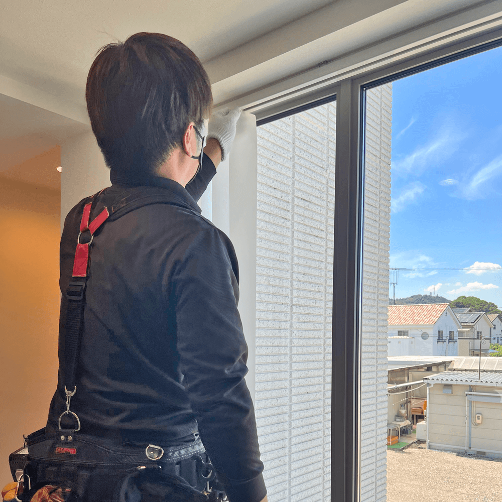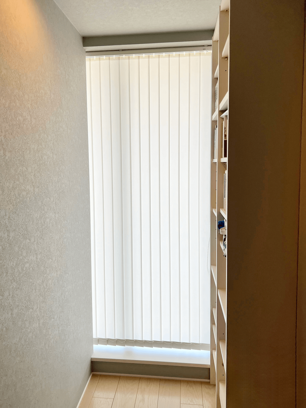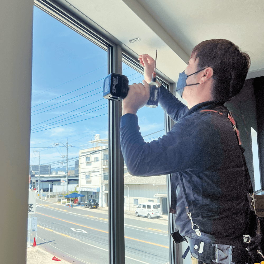 外からの視線と日差しが気になっていた場所に、縦型のバーチカルブラインドを取り付けていく。