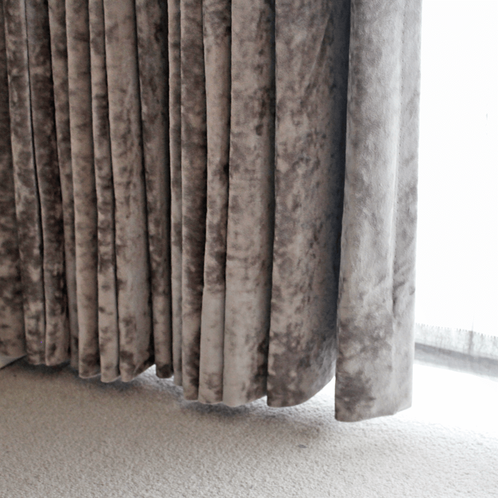 遮光性の高いカーテンだけで選ぶとデザインの幅が狭くなるので、今回は部屋のデザインに合った表地に、遮光性と保温性をアップさせる為に裏地を合わせたメーカー縫製で仕上げたカーテンを取り付け。