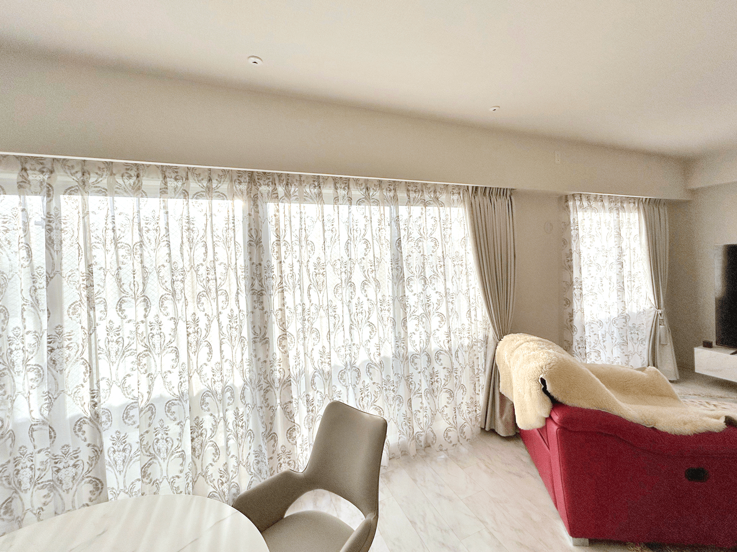 そこで急きょ、お客様に代替えとして生地を再度選んで頂くことにしました。最終的に決まったのは、クラシカルでゴージャスなデザインのレースカーテン(こちらもダブルフィス仕様)。エレガントな印象が際立ち、タワーマンションの最上階にふさわしい高級感が生まれました。