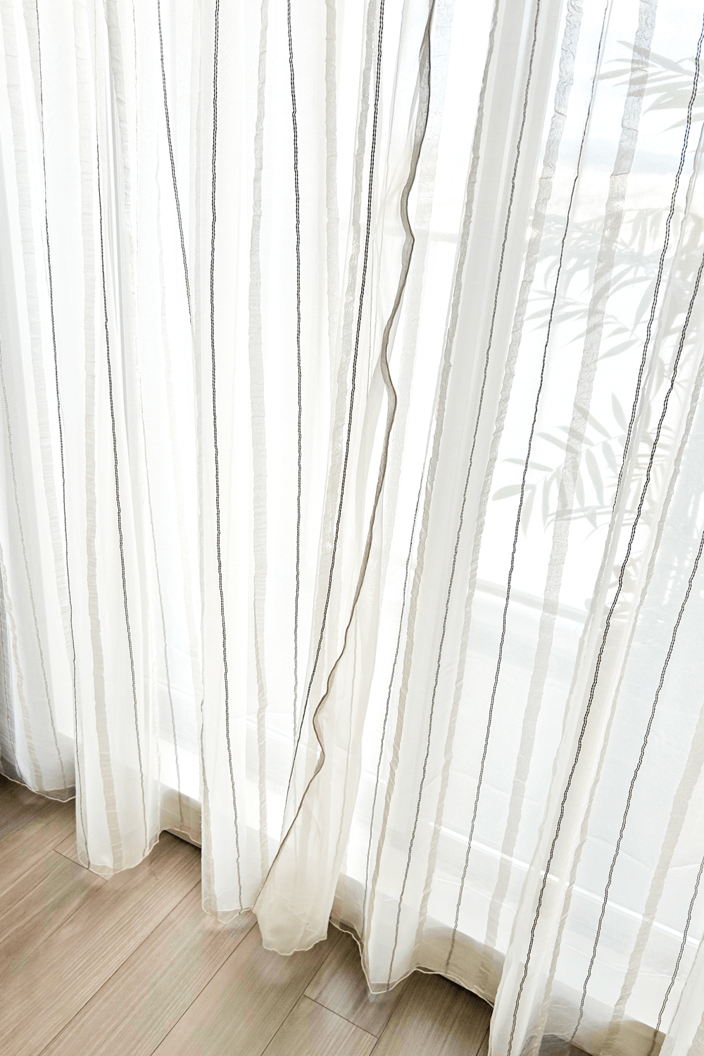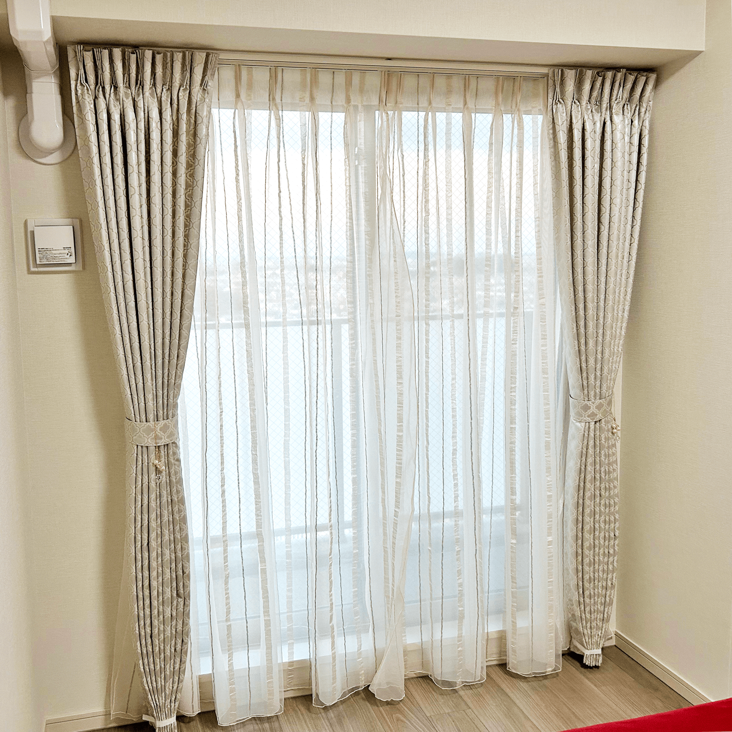 20年来のお付き合いがあるお客様から、セカンドハウスとして購入されたタワーマンションの最上階のカーテン施工のご依頼を頂きました。今回、お客様が気に入ったのは、カジュアルなダブルフェイス仕様のレースカーテン。レースを2枚重ねた独特の風合いが、空間に柔らかさをプラスするデザインです。