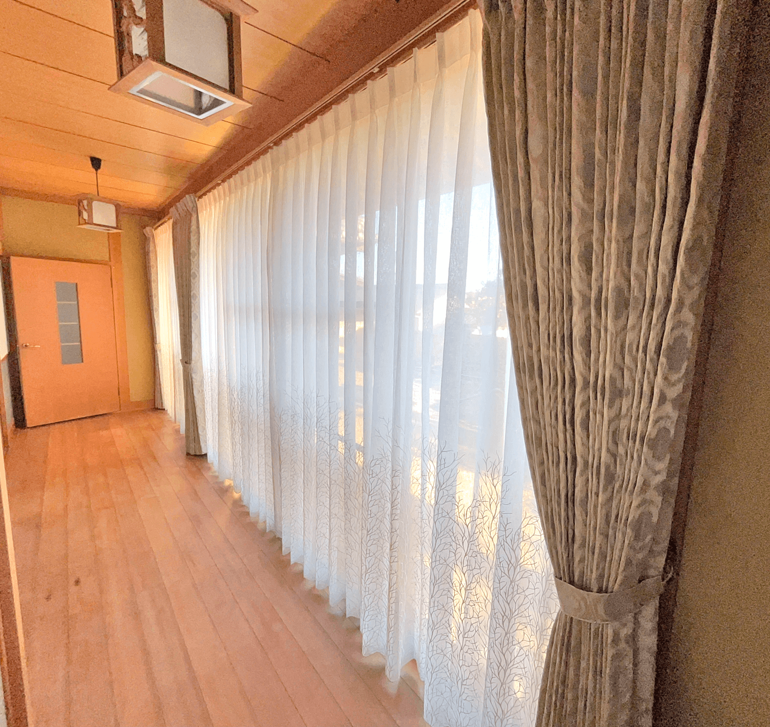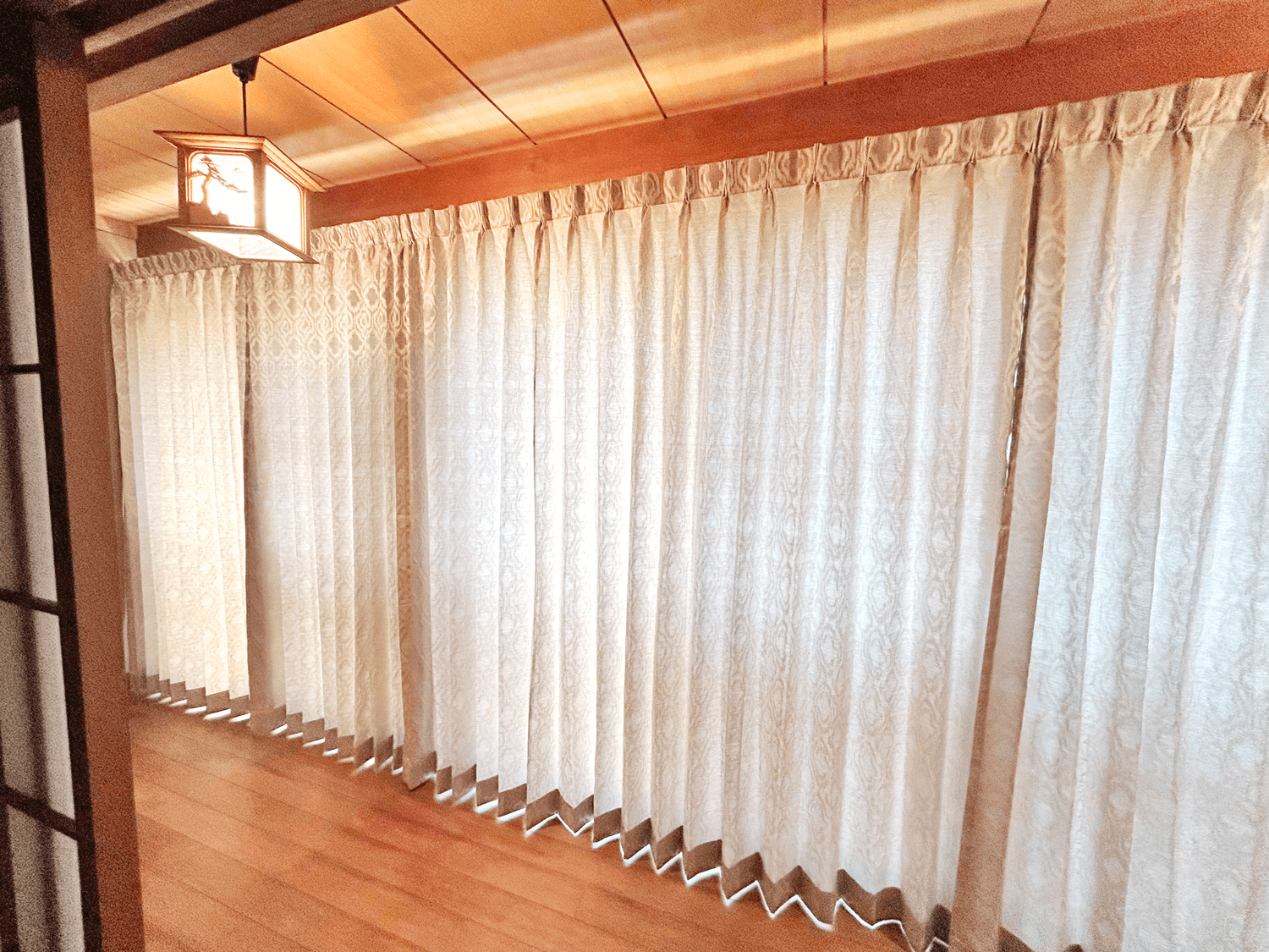 今度は、広縁のカーテン施工のご紹介を頂きました。こちらは裾にエンブロイダリーが施されたレースカーテンを採用。しっかりとした高級感のある仕上がりとなり、ドレープカーテンとの相性も抜群。光の入り具合も計算され、美しく整った空間が完成しました。