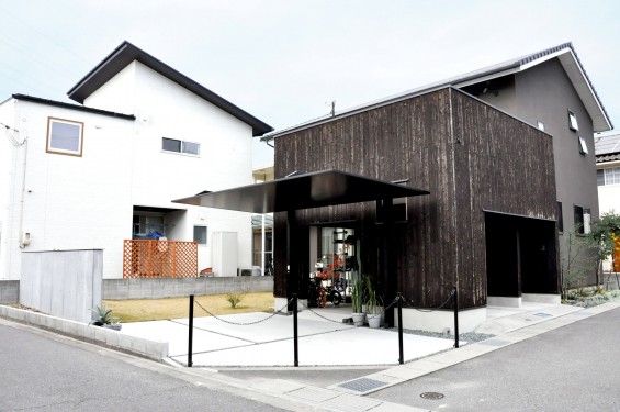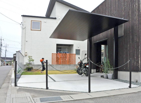 LIXILが発売を開始したときから決めていたというカーポート「SC」の黒。車止めのポールも黒で統一し、焼杉の黒壁とうまくマッチしているところが、ご夫婦のお気に入りです。足元を固めたコンクリートと壁との統一感が、よりスタイリッシュな雰囲気を演出しています。
