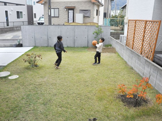 壁ができたことでお子様たちが庭でボール遊びをするようになり、「私たちも一緒に外遊びする時間が増えました」。住宅地がゆえに車の往来は少なくないため、ガードするものができて安心も得られたようです。