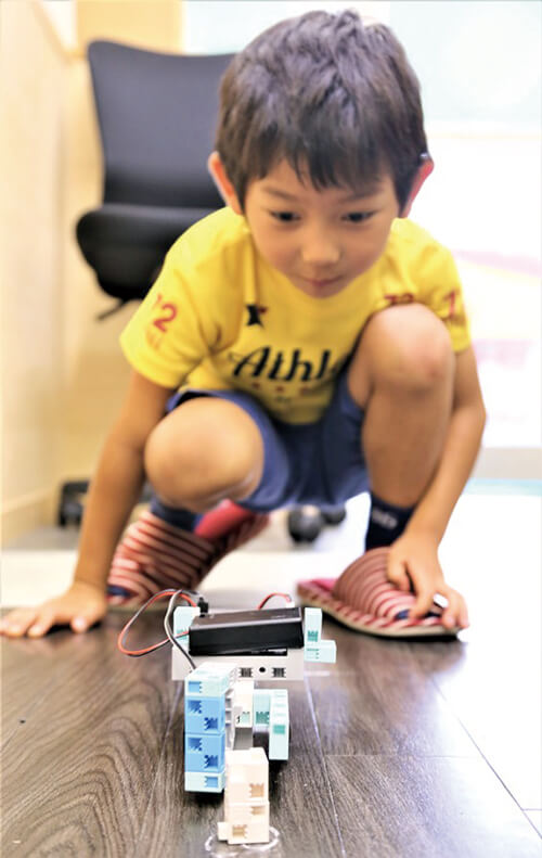 センサーやモーターなどもすべてブロック型で簡単につなげることができ、簡単に作れます。