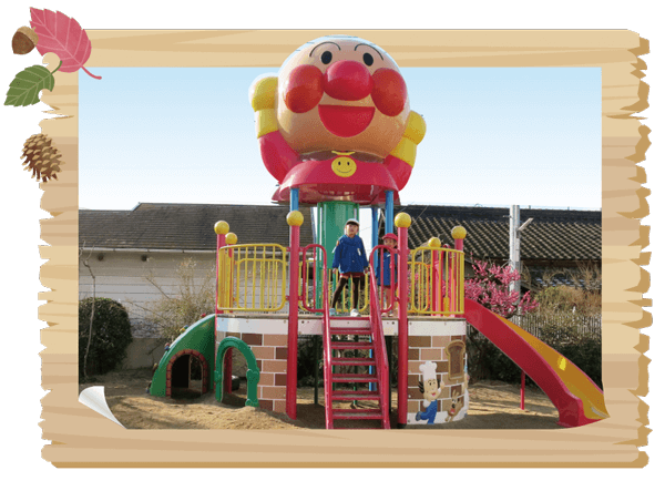 大型遊具も設置されているが、広い運動場に面した、子どもたちが大好きなアンパンマンの遊具は、特に小さい子に絶大な人気。滑り台の下はパン工場のイメージで、中に入ってかくれんぼをしたり、泥遊びをしたり、想像力をふくらませる遊び場にもなっている。