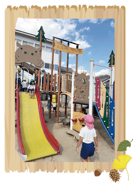 登ったり、橋を渡ったり、降りたりなど、身体をいっぱい使って回遊しながら遊べる遊具。すばる幼稚園からの特注で作られており、「SUBARU FOREST」の看板もかかる。カバの口をくぐるような滑り台の横には、ライオン、てんとう虫など動物がいっぱい描かれている楽しい遊具。