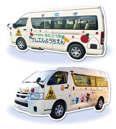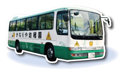 市内広域に4バス(緑・青・赤・黄)計12コースを巡回。同園専用バスを「バスのおじちゃん」で親しまれる職員たちが運転しており、3年間ずっと同じ人が送迎してくれるので安心。送迎以外にも港町グラウンドでの運動、合気道の道場のほか、保育時間内のおでかけ、遠足、社会見学などにも同じバス同じ運転手で親しまれる大活躍バス。ボディにいろんな動物が描かれ、シートもかわいい。