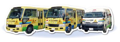 園バスは3台あり、東は福山市瀬戸町~西は尾道市山波町まで巡回している。楽しい絵柄が散りばめられたバスの正面に、園章である平和の象徴ハトが描かれているのが目印。職員が運転手、添乗員を務め、責任をもって安全に送迎している。